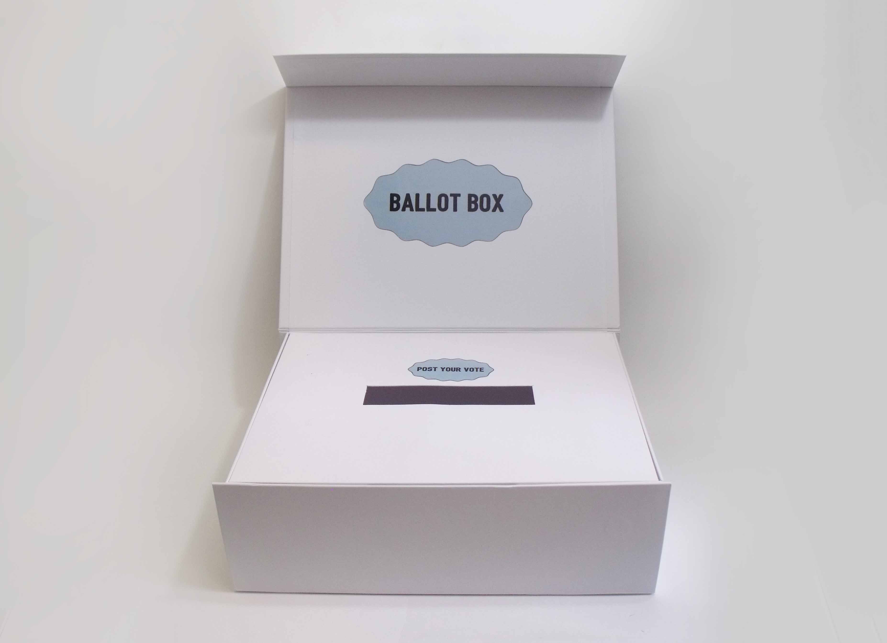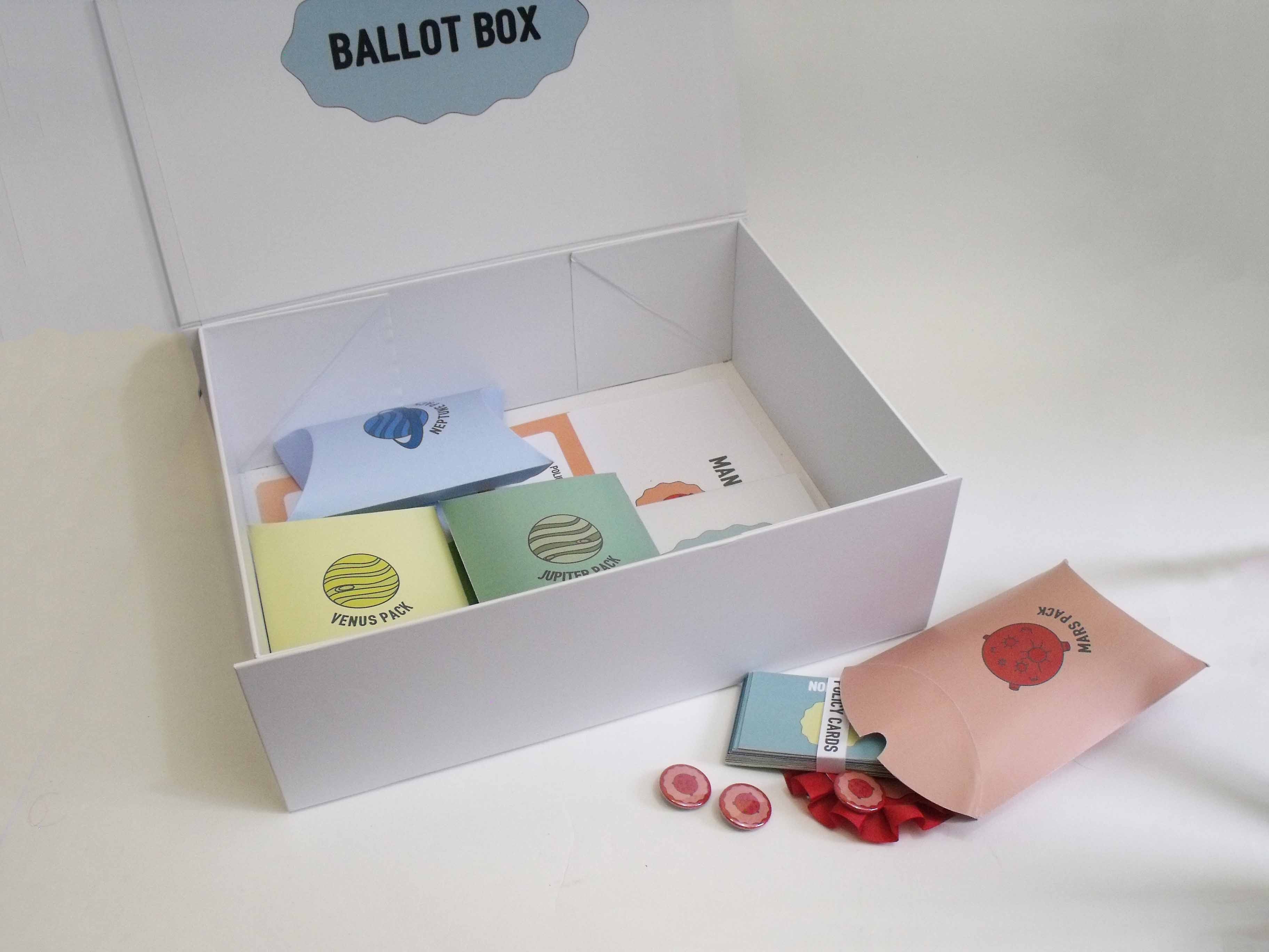 The packaging converts into a ballot box, turning the classroom into a polling station and giving students a memorable, tactile understanding of how elections work.