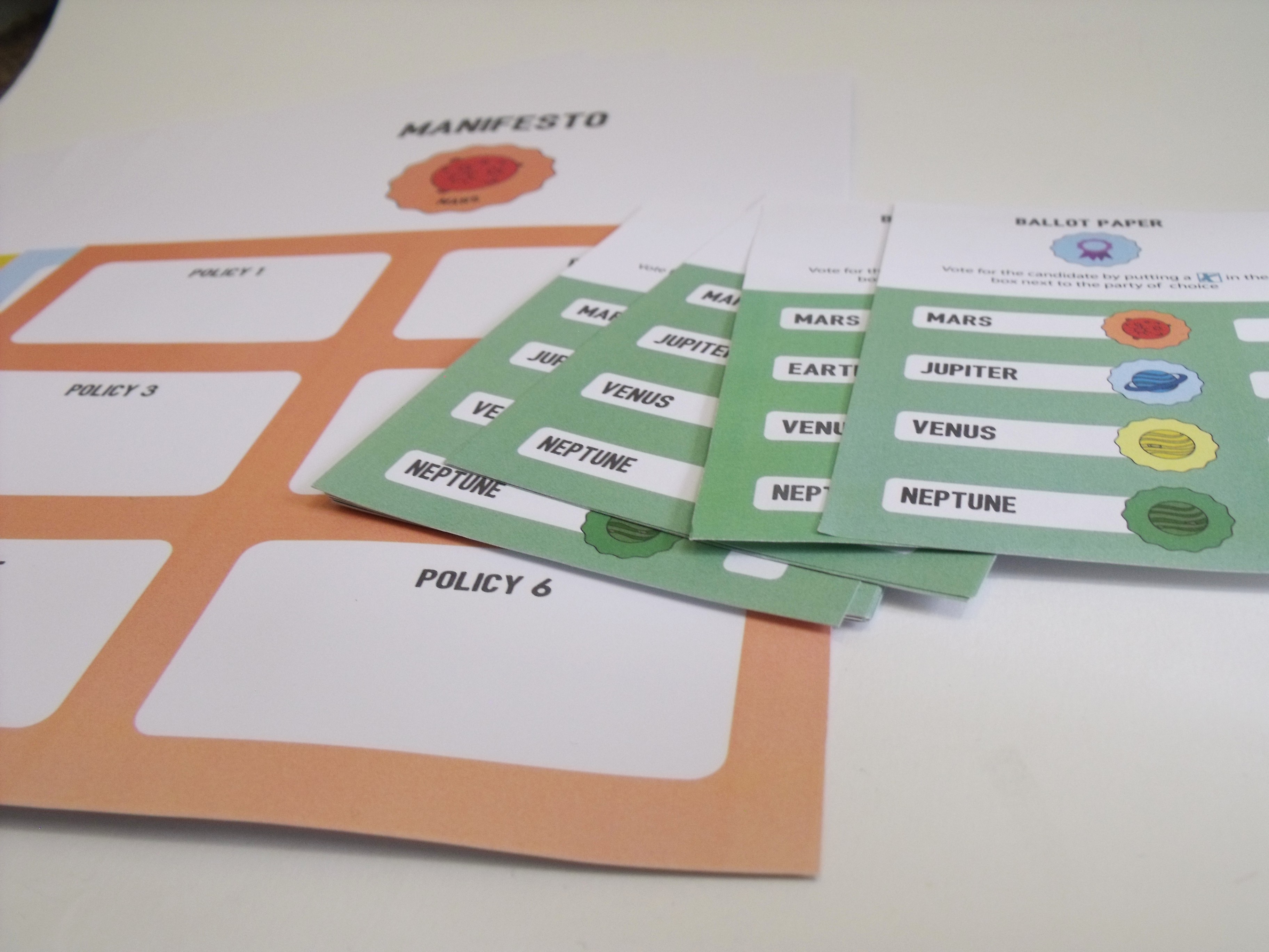 Bold colours, clear layouts, and simplified explanations make complex political ideas digestible, encouraging participation from students who wouldn’t normally engage.