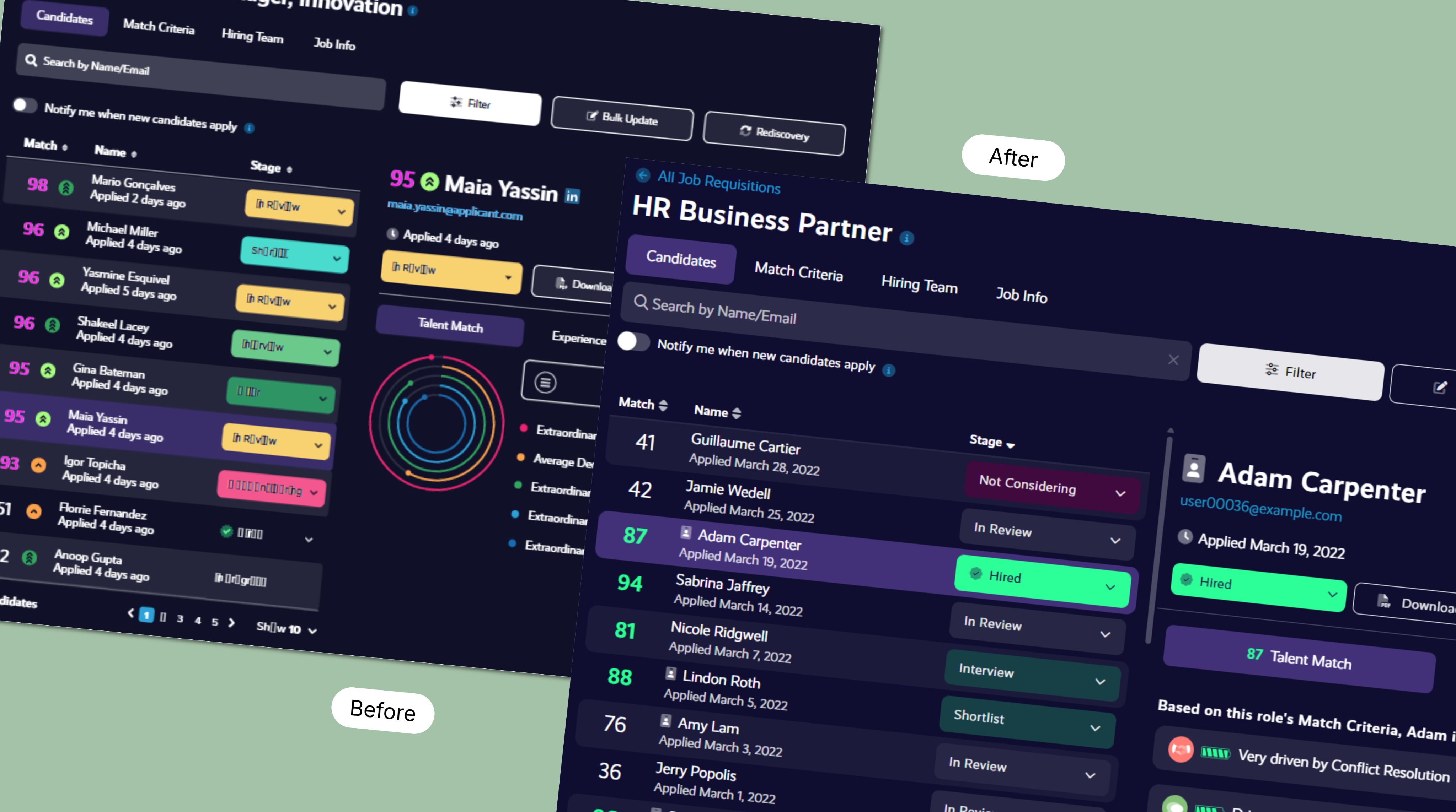 Recruiters found it difficult to quickly interpret and compare candidate matches. Existing visuals were unintuitive, inconsistent with other areas of the platform, and required explanation before they could be confidently used in decision-making.